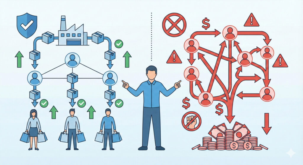- 仕組みの本質: MLMは、広告費の代わりに会員へ報酬を支払う、メーカー直販の流通システム(合法)。