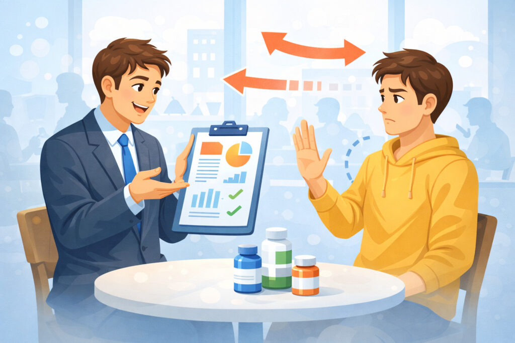 さらに、勧誘の場面で“言い切り”が多いと一気に不信が強くなります。例えば「これ飲めば絶対変わる」「みんな飲んでる」「飲まないのは損」みたいな圧。これを受けると、製品そのものまで疑いたくなるんですよね。ここ、すごく自然な反応です。